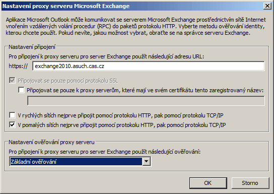 Na kartě Připojení zaškrtneme políčko pod textem Outlook vždy a všude a klikneme na tlačítko Nastavení proxy serveru Exchange….